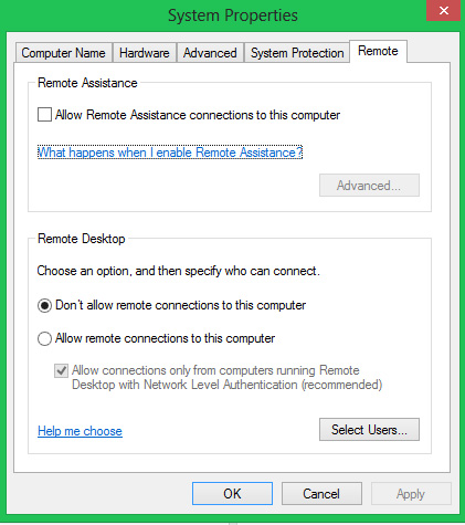 2) Uncheck the top box, and make certain the radio button is blackened in front of Don’t allow remote connections to this computer.
