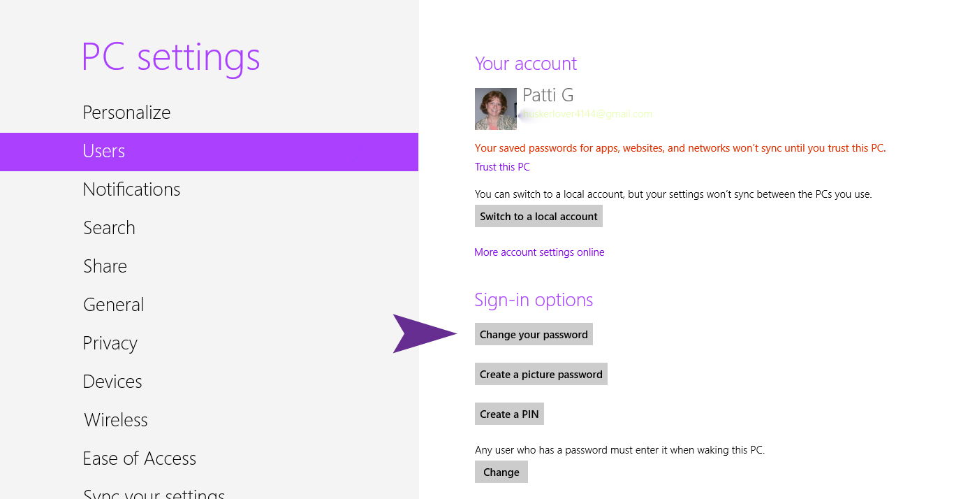To add a password to protect your new super secret Built-In Administrator account: A) Hover over the top or bottom right corner. On your handy dandy side menu, B) click Settings at the very bottom.
